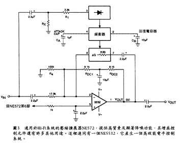 在这两IC上还有其他变种出现,包括NE572,它把0dB参考设定于100MV上,适用于HI-FI录音室质素的系统上;另外SA577/SA578提供有一个电阻可编程0dB参考电压,可调节于10MV与1V之间——图3。